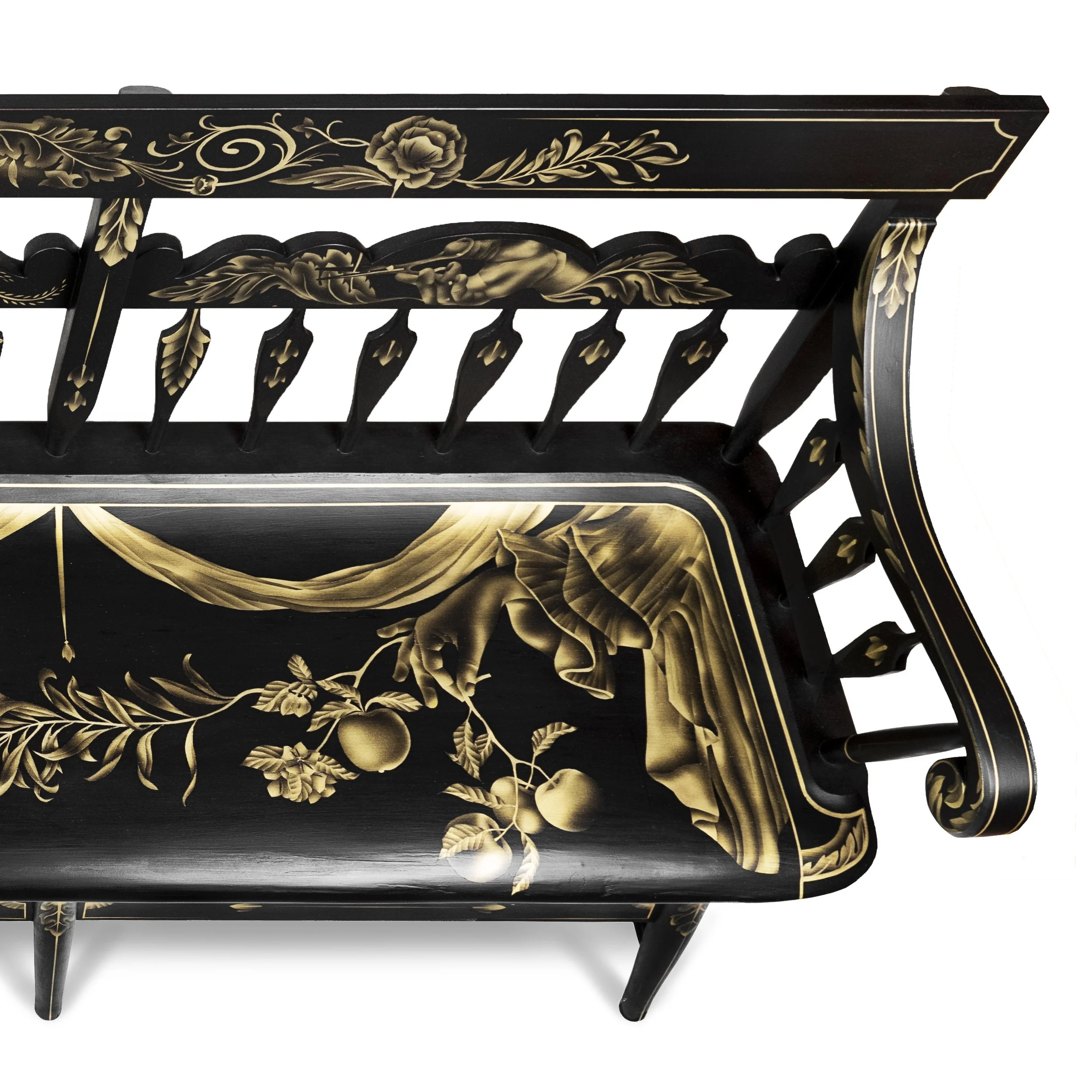 A reimagining of an Arrowback settee with iconic gold-on-black Hitchcock painting, blending contemporary imagery into traditional fruit and garden motifs. Popular in the 17th century, Arrowback settees were not intended for prolonged sitting but functioned as objects of welcome and displays of wealth. The painted imagery reflects this dual role: golden female hands, fruit, scissors, and drapery both offer and withhold symbols of prosperity and hospitality. While garden and fruit motifs were typically static stenciled decorations, here the feminine presence is active—nourishing and destroying plants, emerging from and disappearing into foliage, at once in control of and constrained by colonial symbols.
